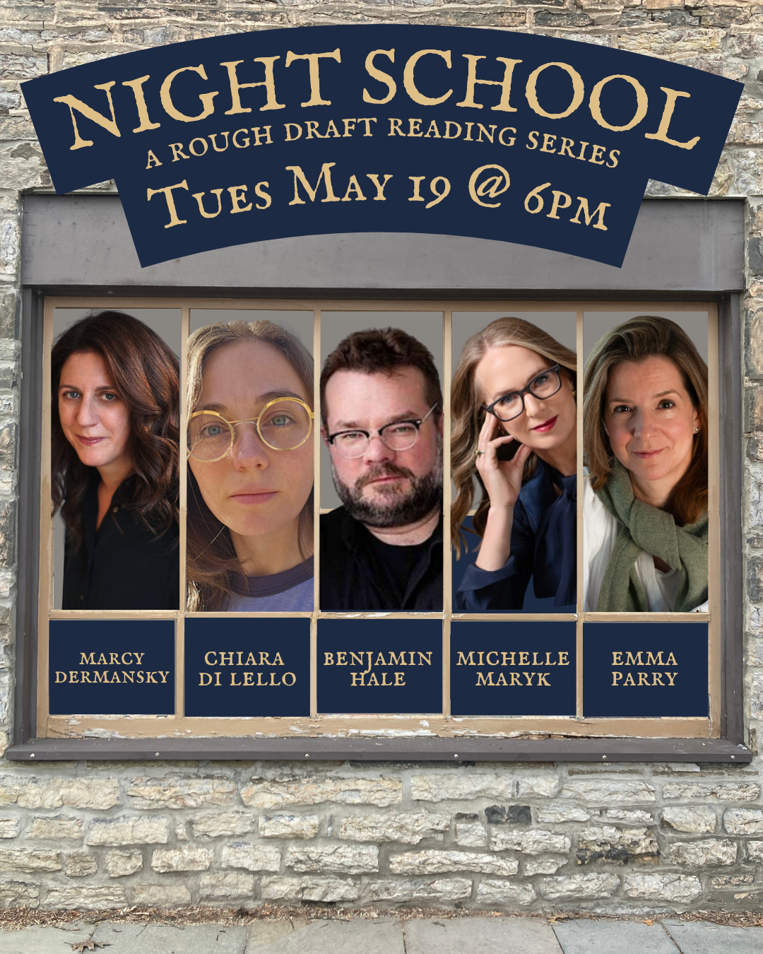 Join us for history, magic, poetry, crime, and FUN with not just four readers but FIVE! Featuring Marcy Dermansky, Chiara Di Lello, Benjamin Hale, Michelle Maryk, and Emma Parry! Free as always and hosted by our own Drew Broussard, the May installment of Night School brings everything you need for that pre-Memorial Day sprint towards summer.
